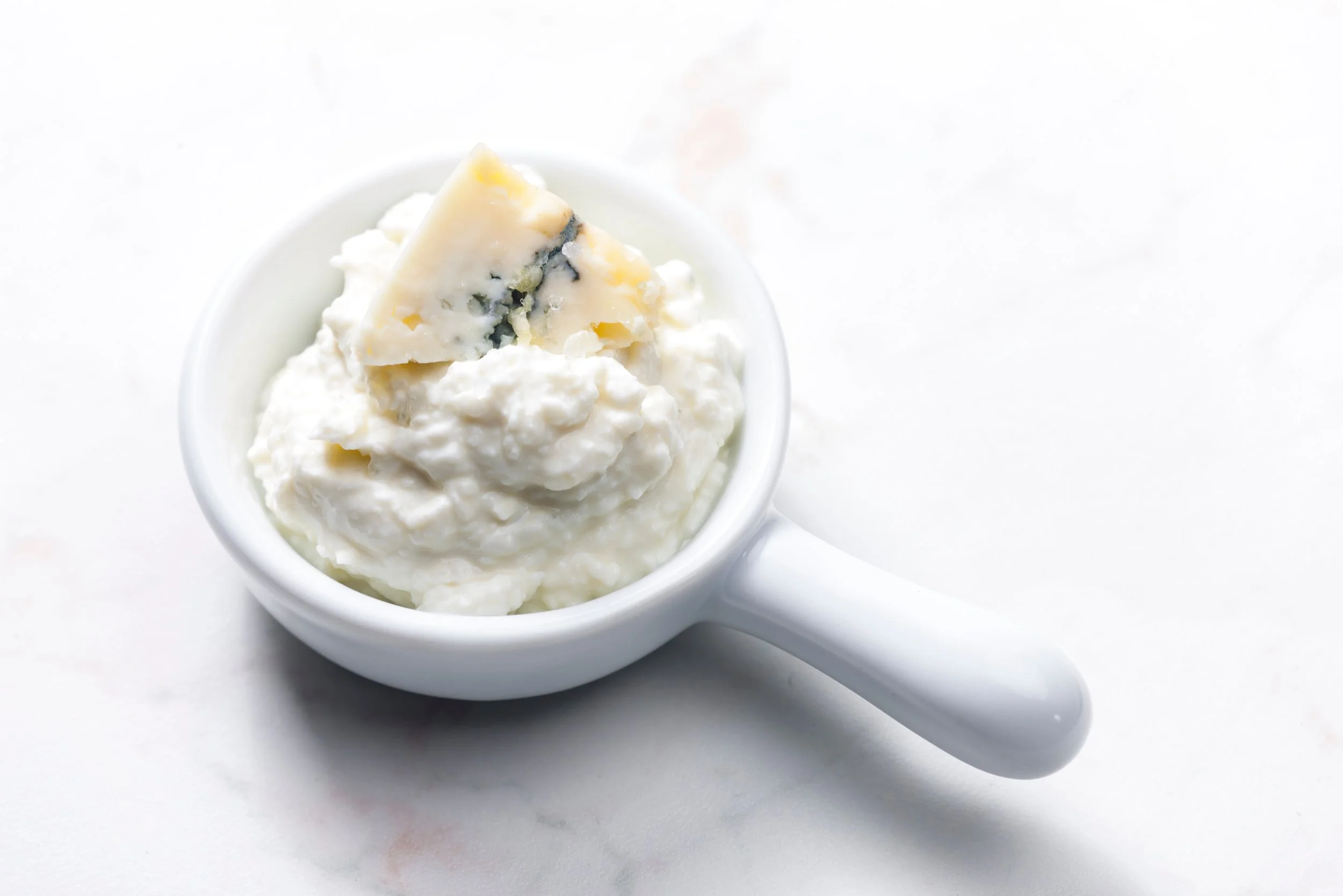 Mash the blue cheese, buttermilk, garlic, vinegar, and sugar until creamy with small curds.